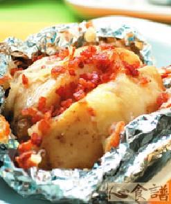 1.马铃薯洗净并沥干水份后,蒸熟并取出对半切至3/2处,再用铝箔纸包起;培根切细末后,备用。