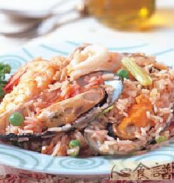 长米150公克,虾子100公克,花枝1只,培根25公克,鸡肉50公克,淡菜4个,洋葱50公克,蒜头15公克,蘑菇20公克,芹菜20公克,青豆仁15公克,鸡高汤250㏄,番红花2公克,无盐奶油30公克,盐1/4茶匙,胡椒粉1/4茶匙