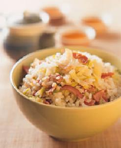 3.)将调味料放入米中略拌匀,再将高丽菜及培根条铺在米上,放入电锅中煮熟,开关跳起后,先不要打开锅盖,让高丽菜饭再焖15分钟,最后用饭匙由下往上轻轻拌匀即可食用。