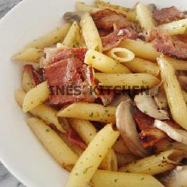 PENNE,培根3片,鲜菇类切片若干,蒜头1粒,红葱头1粒,,意大利综合香草,欧芹适量,盐,胡椒等