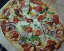 面粉200g,干酵母适量,温水适量,Mazzarella奶酪100g,培根50g,青椒50g,小西红柿50g,洋葱50g,西红柿酱适量,食用油适量