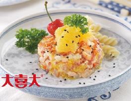 主料:三文鱼200g,培根50g,洋葱100g,香橙30g,意面20g,黑芝麻10g,法香少许,薄荷叶两片,鲜樱桃若干,调料:大喜大烤肉酱适量,芝士15g,沙拉酱15g,黄油15g,大喜大海鲜粉1茶匙