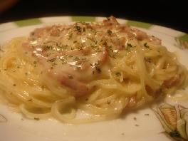 黄油1小块,蒜末,培根肉,面粉,鲜奶油,干白,切碎起司,欧西芹(Parsley),黑椒粒,盐,极细二号意大利面