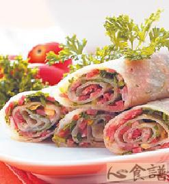 2.取一片作法1的蛋饼皮,抹上2大匙的甜玉米酱、撒上2大匙的甜玉米粒,再放上1片作法1的培根及1根香菜,撒上适量胡椒盐后包捲起(重复此步骤至材料用毕)。