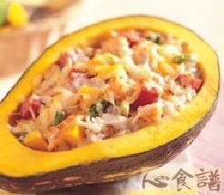 4.将作法3的材料装入作法1的南瓜容器中,舖上乳酪丝,用预热200℃的烤箱烤约5分钟,至表面金黄、香味四溢即可。