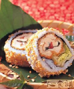 4.海苔片舖上薄薄满满的寿司饭,覆盖上一层保鲜膜后,将海苔片翻面朝上,加入萝美生菜,再放入作法3后捲起并沾上杏仁角即可。