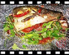 2.鱼很长,烤箱放不进去,没办法切开了,鱼肚子里放了葱姜蒜等调料,还有西红柿,青菜,尤其放了特意买的蒸鱼豉油,