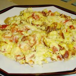 鸡蛋10个,低脂牛奶5汤匙,盐1/2茶匙,美国辣椒仔(塔巴斯科)牌原味辣酱4大滴,或适量,熟培根肉(烟熏猪肉)225克,切小碎块,黑橄榄100克,去核,切碎,李子形番茄2个,切小碎块,青葱4条,切细,蘑菇50克,切薄片,淡味车达奶酪100克,磨碎