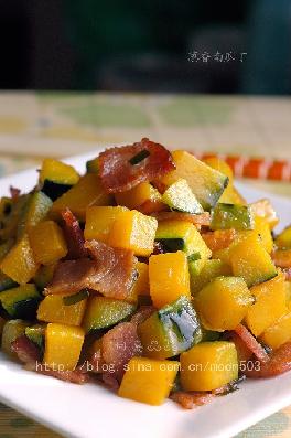 嫩南瓜1/4个,培根三片,葱