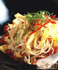 5.将作法1的天使面放入作法4的锅中拌炒,以盐、胡椒调味后盛盘,最后摆上蛋皮丝及作法2的培根碎即可。
