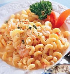 3.加入虾仁、红萝卜丝、义大利香料、豆蔻以及作法1煮好的通心面,再加入牛奶、两种起士略煮2分钟,最后加盐调味即可。