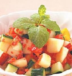 1.苹果、蕃茄、小黄瓜、黄甜椒洗净切丁;薄荷叶洗净切碎放入碗中备用。