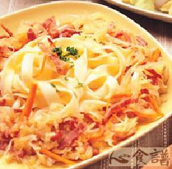 培根丝200公克,洋葱丝55公克,胡萝卜丝55公克,蒜片约6粒量,辣椒丝适量,包心菜丝适量,高汤500cc,糖15公克,白醋100cc,白酒150cc