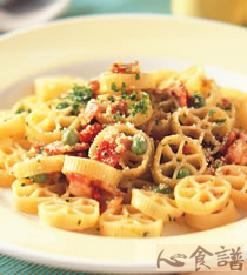 4.热锅,放入溶化奶油20g,先炒香蒜碎、培根碎,加入洋葱碎30g炒软至上色后,再加入培根片、作法2.的青豆泥及作法3的车轮面拌炒匀,最后以盐、胡椒、起司粉调味即可。