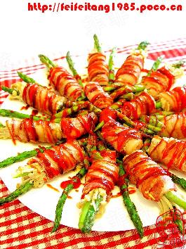 1.将BACON平铺开,放金针菇,芦笋,并用牙签固定。