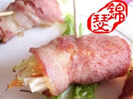 新买回来的培根,作了点培根蔬菜卷,我自己觉得好吃到天上去了,老公尝了后说,不就是腊肉嘛。我也觉得其实味道差不多的,培根又名烟肉(Bacon),是将猪未经腌熏等加工的猪胸肉,或其他部位的肉熏制而成。和我们的腊肉制作和风味都类似。其实,天下的美食应该都是相通的吧。 在西方,烟肉一般被认为是早餐的头盘,将之切成薄片,放在锅子里烤或用油煎。我跟坛子里姐妹们学的蔬菜卷,把肉类和蔬菜结合起来,营养搭配更合理一些。