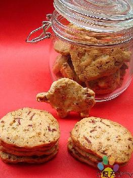 黄油85克,糖40克,低粉200克,葱,松子40克,蛋清1个,培根5片
