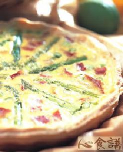 5.将作法1的芦笋丁、培根平均放在作法4的派皮底部,倒入蛋奶液至烤盘约8分满处,排上作法1对切的芦笋段即放入烤箱,以180/180℃烘烤约25~30分钟即可。