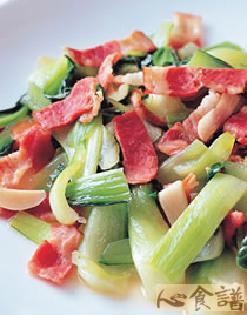 2.炒锅放入2大匙沙拉油爆香蒜片和培根,再加入作法1的青江菜和调味料以大火炒熟即可。