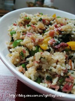 这两天忙死了。也不知道忙什么,反正感觉24小时都不够用。用留美坐家的语言来形容最贴切不过,穷忙族!又忙又穷的人。 而且,还特别的困!不知道是咋回事?难道是“秋困”?下班回家后都恨不得马上倒在床上呼呼大睡。唉!这周末得去做个全身的检查。看看,到底是不是身体出现了什么毛病?本来,体检的事情老早就得去做的,但是一直拖拖拉拉的,这周末推下周末再推下下周末。。。每次到周末,我就会跟BF说,明天我去体检,你去打疫苗。他很坚定的说no problem.结果呢,第二天闹铃响了N次,你推我,我推你,就是起不来,干脆一睡到11点多。连早餐都省了。 今晚下班回来,累得半死,又饿得快不行了,打开冰箱,看见还剩有周末买的培根、菜心、彩椒,昨晚吃剩的剩饭,赶紧炒了个饭,把肚子填得饱饱的,一天的事情总算忙完。这日子过得不容易啊! 累了,话也不想多说了,赶紧上菜。