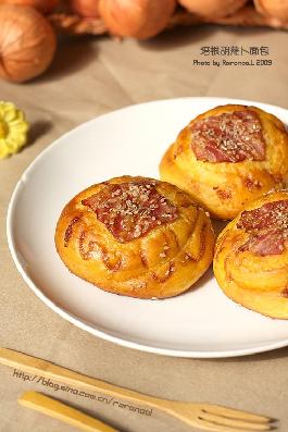 继话说某天清理冰箱.在冰箱的最里边发现了2包培根~很好很强大.晕了..我咋就能把这东西忘的一干二净喃.这款面包的面包体依然用的胡萝卜面包体.哦也也~为什么会还是用胡萝卜的~因为我买了根很大的胡萝卜.够做2次面包的~
