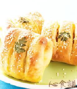 面糰:192公克,低筋面粉192公克,新鲜酵母12公克,水115㏄,盐6公克,细砂糖93公克,蛋30公克,奶水48㏄,奶油62公克,布丁大理石片500公克,其他:1/2颗,培根3条,盐少许,胡椒粉少许,蛋1颗,白芝麻适量,香菜叶10片