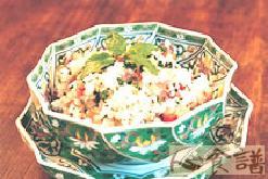 2.)把饭盛在一个大碗里,放入1大匙的培根料,和另外切好的薄荷细丝,用木匙轻轻拌匀再放入喜欢的餐具里。