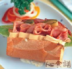 法国面包1/4条,火腿片1片,培根2片,起司1片,生菜1片,酸黄瓜2片,塔塔酱2大匙,奶油40g,煎熟蛋1片