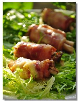 1.茶树菇洗净去脏根,用热水焯烫一下捞出控水。把一长片的培根分开两半,卷入茶树菇和苦菊