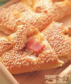 5.将作法4桿成牛舌状,中间包入调味好的洋葱、培根、乳酪条等内馅,由旁边折起成长条状,表面沾裹白芝麻。