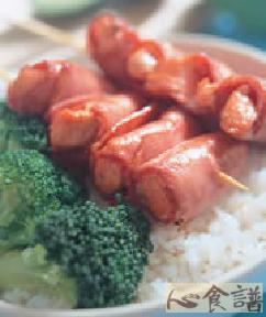 2.培根片对切成8片,摊开后放上作法1的一条鲑鱼条及适量的洋葱丝,包起成捲,再以竹签串起,重复此动作至材料用毕。