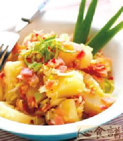 4.将作法1的马铃薯丁、作法3的培根丁混合后淋上香草美乃滋,再以作法2的捲生菜围在盘边即可。