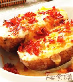 3.取一烤盘,放上作法1对切的马铃薯,淋上适量作法2的酱汁,再撒上一层起司丝,即为半成的焗烤培根洋芋。