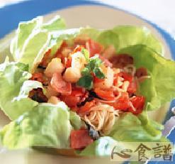 2.热锅,以中火将培根炒至出油,再放入蒜末煎炒至金黄色,然后加入干贝、白酒、蕃茄一起煮3~4分钟入味,再加入盐、黑胡椒粉调味,最后加入百里香碎、九层塔片及作法1的面条拌匀即可。