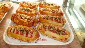 1:甜面团60克、2:将面团擀开包入肉松,卷起呈12公分长,放长形纸托。
