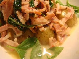 有机小土豆,奶油1小块,白葡萄酒,鲜奶油,培根肉条,新鲜罗勒,马苏里拉起司