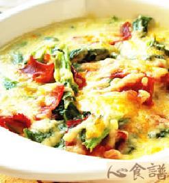 4.预热烤箱至180℃,将作法3半成品的焗烤培根菠菜放入烤箱中,烤10-15分钟至表面呈金黄即可。