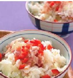 白米2杯,高丽菜180公克,洋葱80公克,培根100公克,水2杯,红椒丁少许,盐1/2小匙,沙拉油1大匙