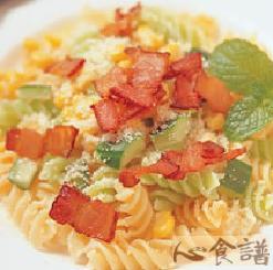 义大利螺丝面80g,培根2条,玉米粒20g,小黄瓜粒1/2条,义大利沙拉酱3大匙,芝士粉少许