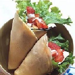 3.将生菜、起司片、海苔依序叠在一起,舖在可丽饼上,然后在饼皮2/3处对折,两侧回折交叠,卷成圆锥状,再将培根、热狗块、玉米粒、凤梨丁填入,挤上作法2的美乃滋酱即可。