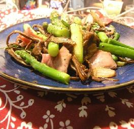 芦笋,鲜茶树菇或干茶树菇泡开,培根3条,蒜几瓣,盐一小勺