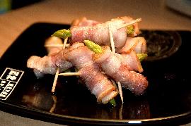 2.用培根将8厘米长短的芦笋包卷,成卷下五成热的油锅炸熟,倒入漏勺内沥净油,锅内放入芦笋卷对汁下锅快速翻动即可装盆。
