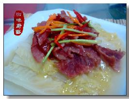 1.将大白菜洗净切长段,在开水中氽一下,码在盘中。将培根切成2寸半左右的段,摆放在白菜上,浇上加盐、味精、鸡精调好的汤汁。