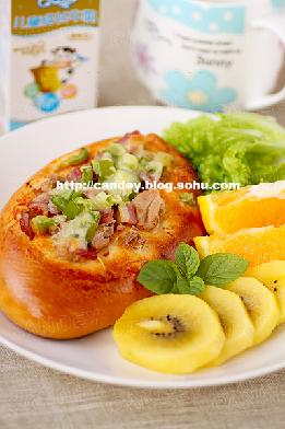 高粉300克,酵母3克,糖30克,盐4克,蛋液38克,牛奶约160克,黄油25克,辅料(6个量):金枪鱼罐头一罐,元椒一只,培根两片,番茄沙司,黑胡椒粉,马苏里拉奶酪丝各适量