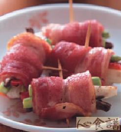 2.培根上排入作法1的青芦笋段、山药条、鲜香茹条、红椒条,撒上胡椒盐,将培根捲成一束,再用牙签固定。