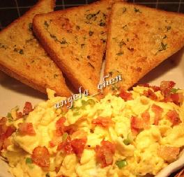 前两天为大家介绍了一种面包的吃法。今天追加一款我个人最喜欢的——大蒜面包。可能没吃过的人听起来会觉得奇怪,甚至会怀疑好不好吃。 在英国时,每次在院子里烧烤都少不了大蒜面包的压轴。酥香的面包透出浓浓的蒜香。咬一口下去,金黄的蒜油从面包中渗出来。配上英国人最爱的,培根滑蛋。做好的话,可以滑嫩的好似内脂豆腐。可千万别错过如此的人间美味啊~ 先做大蒜面包,烤的时候开始热牛奶做滑蛋(做蒜油的锅不用刷直接煎培根就好了)。另外又做了个生菜沙拉。等面包烤好后一切都准备好了,剩下的工作就是——吃早餐~~。早餐过后红茶也泡好了,边品茶边发这篇稿子。相信你们也闻得到我家的面包香和茶香吧:) 提示:红茶要在早餐后的20-30分钟后喝,可以助消化去油腻。