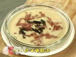 3、把黄油化开,加少许面粉炒出香味,再将打好的蘑菇汤倒入锅中,加鸡精、盐,烧开后出锅,在汤上放入紫菜、培根即可食用。