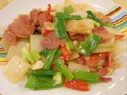 材料:培根100克,白萝卜300克,葱2根,辣椒1根,蒜头2瓣