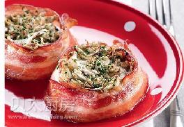 培根(Bacon):即猪五花肉,一般是生食品或烟熏食品,食用前需用油煎制一下,煎制后会带有浓厚的肉香味。在西餐里比较常见,通常作为早餐、三明治或沙拉等使用。