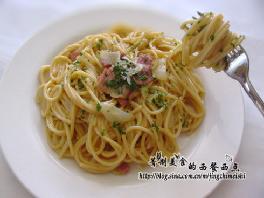1,用黄油把培根煎熟,把煮好的意大利面条放锅里和培根一起炒。